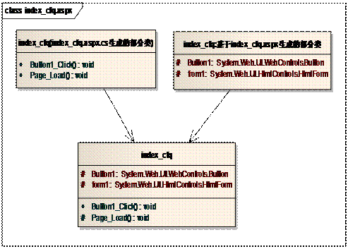 其中index_cfq.aspx文件编译后,实际上会产生两个类,一个是index_cfq的部分类,与index_cfq.aspx.cs文件编译后产生的index_cfq部分类一起构成index_cfq完整类。